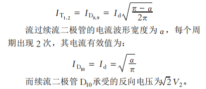 加了續(xù)流二極管后其輸出電壓波形V3與不加續(xù)流二極管時相同。原先流經(jīng)橋臂上元件的續(xù)流電流變成通過二極管續(xù)流。各原件中流過的電流波形和變壓器副邊電流波形明顯有一定的間隔。每個周期中流過晶閘管T1、T2、D8、D9的電流波形寬度都是π—α,其電流有效值為(Id為負載電流)
