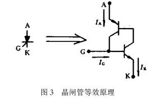 晶閘管的結(jié)構(gòu)相當于串級雙晶體管模型P一N一P一N4層結(jié)構(gòu),因而具有3個PN結(jié),分別引出陽極A,陰極K,門極G。在圖3結(jié)構(gòu)里無論在PNP和NPN晶體管的A一K端點施加正向電壓還是反向電壓,其中的P一N一P一N結(jié)構(gòu)都處于高阻阻斷狀態(tài),只通過很小正向漏電流或很小的反向漏電流,與一般二極管的反向特性相似。一旦門極電流Ic注入G點,就會由于形成強烈的正反饋導(dǎo)致PNP和NPN進入完全飽和狀態(tài),即晶閘管飽和導(dǎo)通。