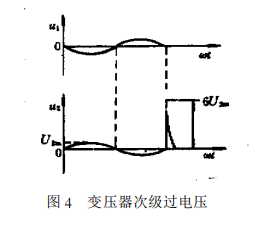 另一方面,直流屏變壓器交流側(cè)也會由于大容量負載如大變比變壓器的合閘瞬間、其它負載切斷電源時以及整流變壓器電刀閘的開關(guān)斷開,也會由于初次級繞組間的分布電容,變壓器的激勵電流的突變在次級產(chǎn)生瞬時過電壓,其尖峰值可達工作電壓峰值的6倍以上,如圖4所示。