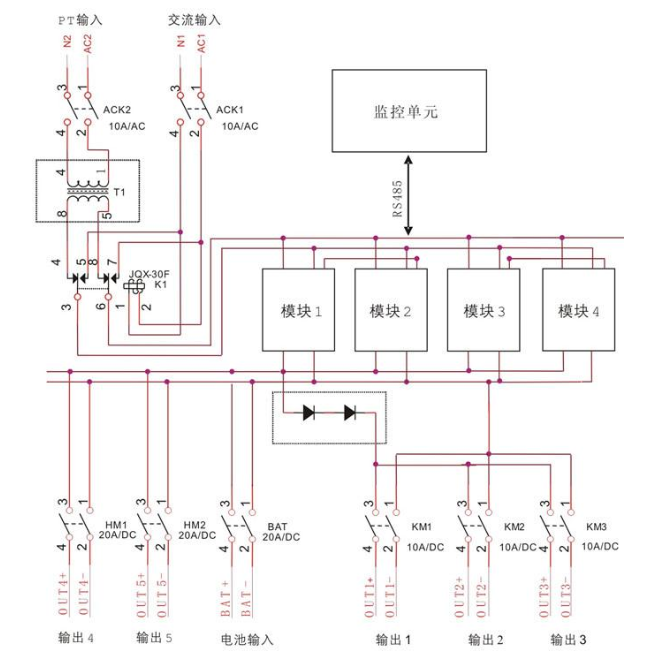 將控制電壓和合閘電壓分配給各負(fù)載支路,可實(shí)現(xiàn)多種母線的接線方式,并具有配電監(jiān)控、直流絕緣監(jiān)測、開關(guān)量監(jiān)測等。