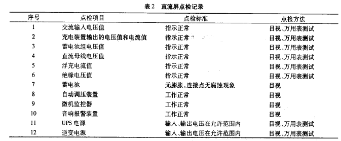 首要需求編制點(diǎn)檢規(guī)范,編制出符合實(shí)際出產(chǎn)需求的點(diǎn)檢規(guī)范,使其他點(diǎn)檢者能快速、簡(jiǎn)潔執(zhí)行點(diǎn)檢規(guī)范。點(diǎn)檢規(guī)范的內(nèi)容觸及方面比較多,列入點(diǎn)檢處理規(guī)模的部位也比較多,例如直流屏,溝通輸入電壓值、充電裝置輸出的電壓值和電流值、蓄電池組電壓值、直流母線電壓值、浮充電流值、絕緣電壓值、蓄電池、自動(dòng)調(diào)壓裝置、微機(jī)監(jiān)控器、音響報(bào)警裝置、UPS電源、逆變電源等都是關(guān)系到直流屏安全運(yùn)轉(zhuǎn)的重要參數(shù)及裝置,確定為點(diǎn)檢部位。點(diǎn)檢部位確定后,就要落實(shí)點(diǎn)檢內(nèi)容,點(diǎn)檢辦法目前還是以簡(jiǎn)單東西、儀器和人的感觀為主的點(diǎn)檢辦法。因而,點(diǎn)檢內(nèi)容首要是查看設(shè)備溫度、電壓、表計(jì)指示、工作狀況等方面參數(shù)。直流屏設(shè)備點(diǎn)檢工作首要是以日常點(diǎn)檢為主,定時(shí)點(diǎn)檢為輔。日常點(diǎn)檢首要以人的感官為主,經(jīng)過(guò)聽(tīng)、摸、看.擰等辦法對(duì)運(yùn)轉(zhuǎn)中的設(shè)備進(jìn)行一個(gè)外觀的查看。經(jīng)過(guò)每日進(jìn)行的點(diǎn)檢工作,及時(shí)發(fā)現(xiàn)設(shè)備存在的危險(xiǎn)并消除,使設(shè)備長(zhǎng)周期安全運(yùn)轉(zhuǎn)。由于直流屏的特殊性,展開(kāi)的直流屏設(shè)備專業(yè)點(diǎn)檢也很重要,點(diǎn)檢辦法以工用具、外表和人的感觀為主的點(diǎn)檢辦法。經(jīng)過(guò)定時(shí)進(jìn)行的點(diǎn)檢工作,及時(shí)發(fā)現(xiàn)設(shè)備存在的危險(xiǎn)并消除,使設(shè)備長(zhǎng)周期安全運(yùn)轉(zhuǎn),見(jiàn)表2。